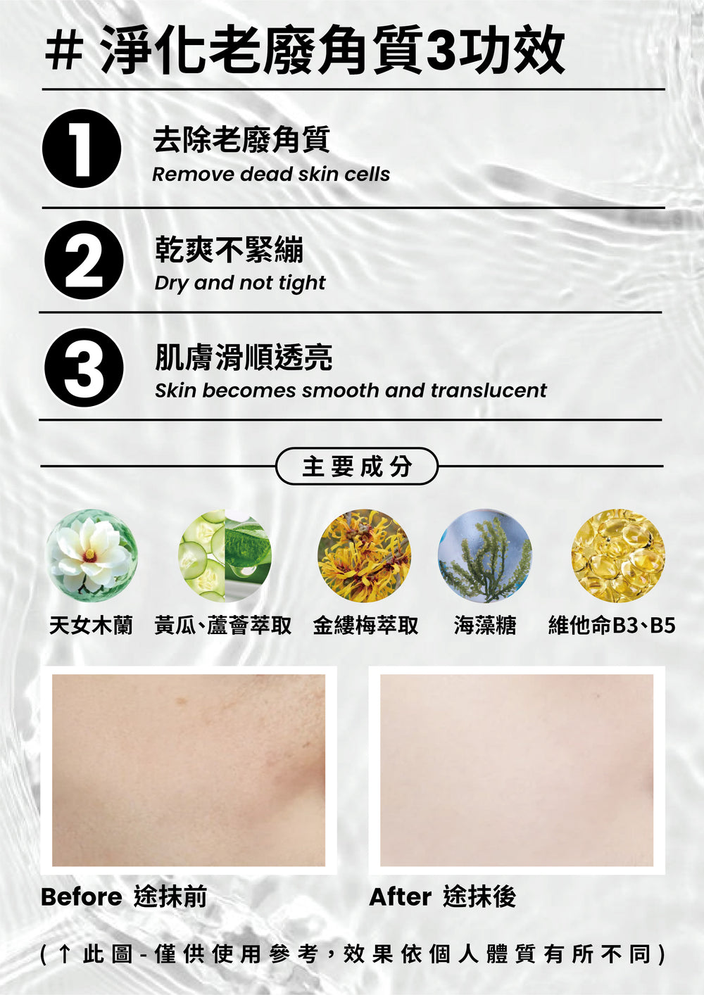 用 途|溫和去除角質,促進角質更新代謝,讓肌膚感覺更加光滑。