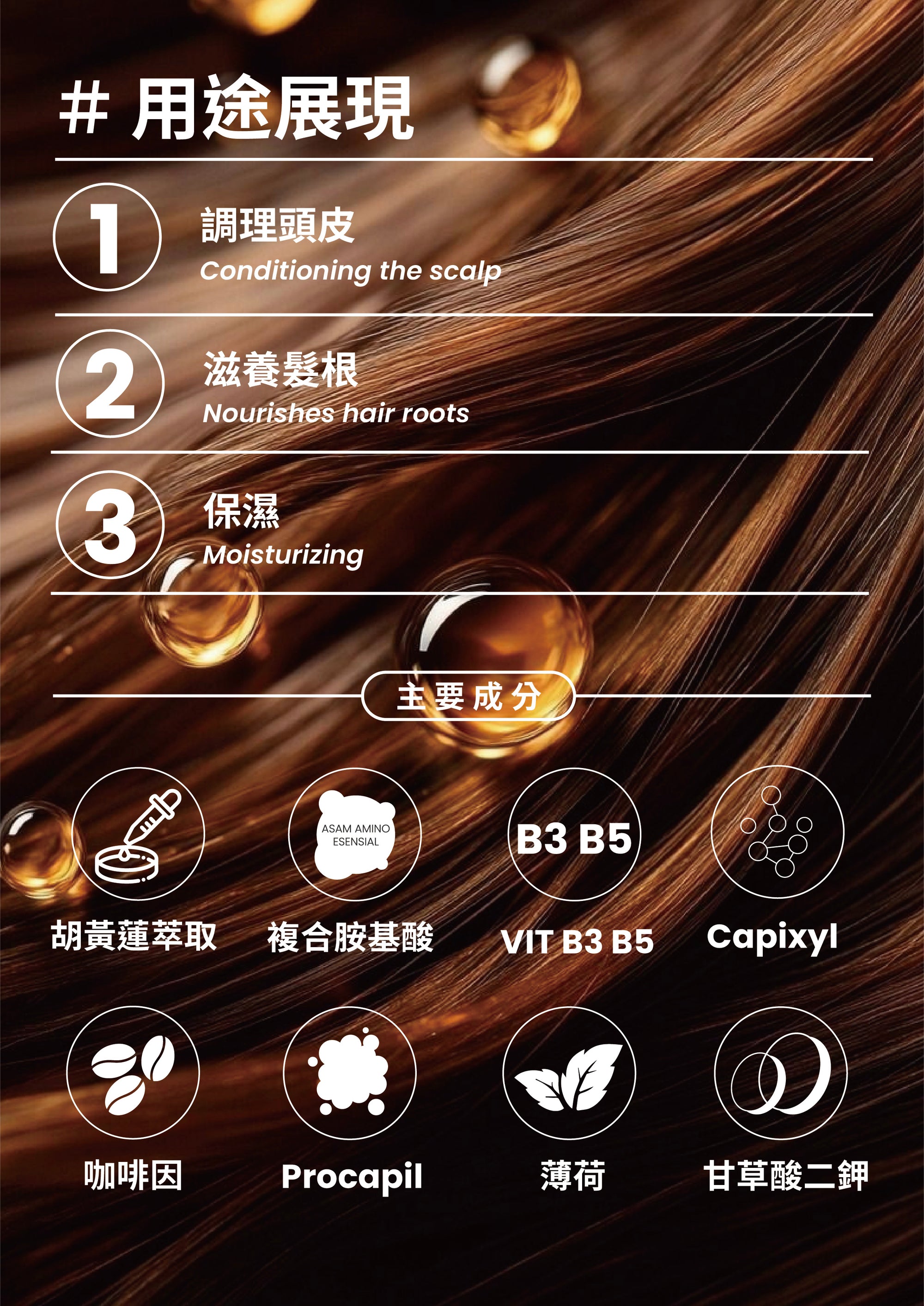 主要成分|PROCAPIL(生物素三胜肽)、Capixyl(法國紅花苜蓿萃取、四胜肽)、咖啡因、胡黃蓮萃取、複合胺基酸、甘草酸二鉀、VIT B3、VIT B5、薄荷。