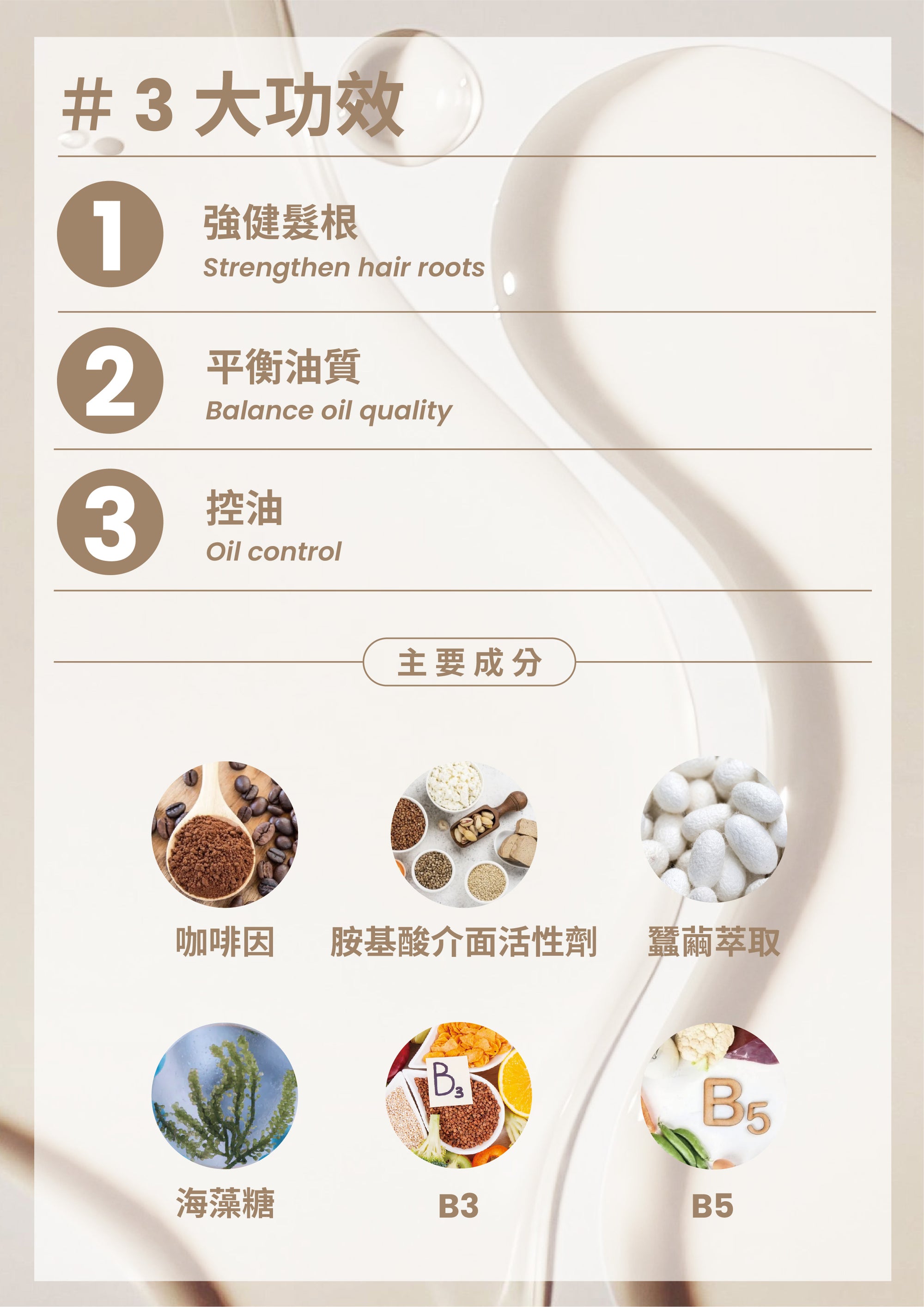 主要成分|雙甘油、胺基酸介面活性劑、海藻糖、 Calm Yang Ⓡ 、複合胺基酸、卡瓦椒萃取、蠶繭萃取、咖啡因、VIT B3、VIT B5、Defenscalp PF。