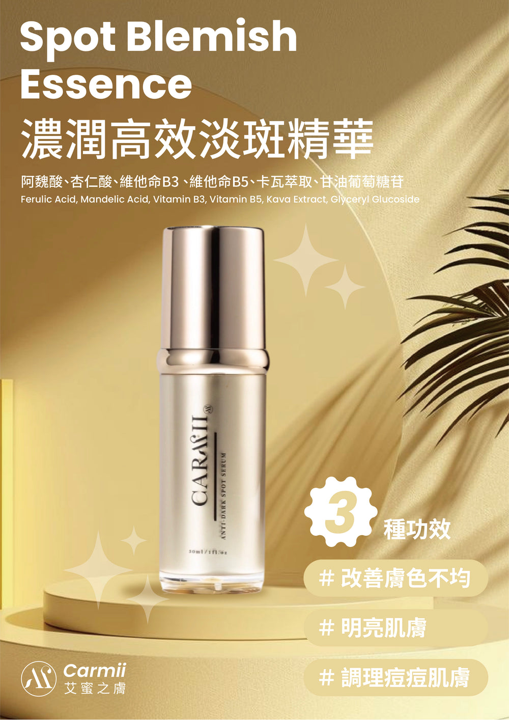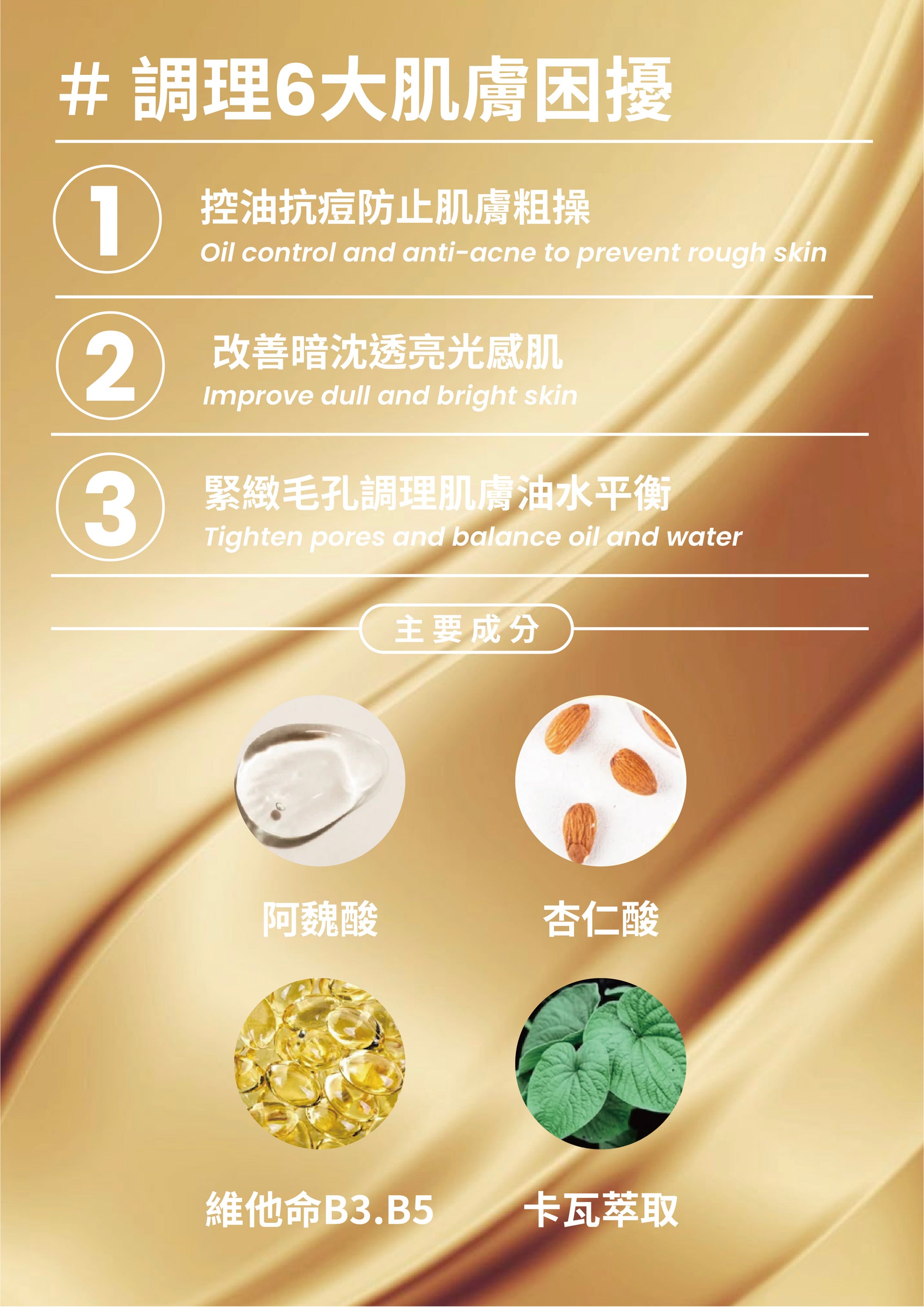 主要成分|阿魏酸0. 5 %、杏仁酸15%、維他命B3 3%、維他命B5、卡瓦萃取,甘油葡萄糖苷。